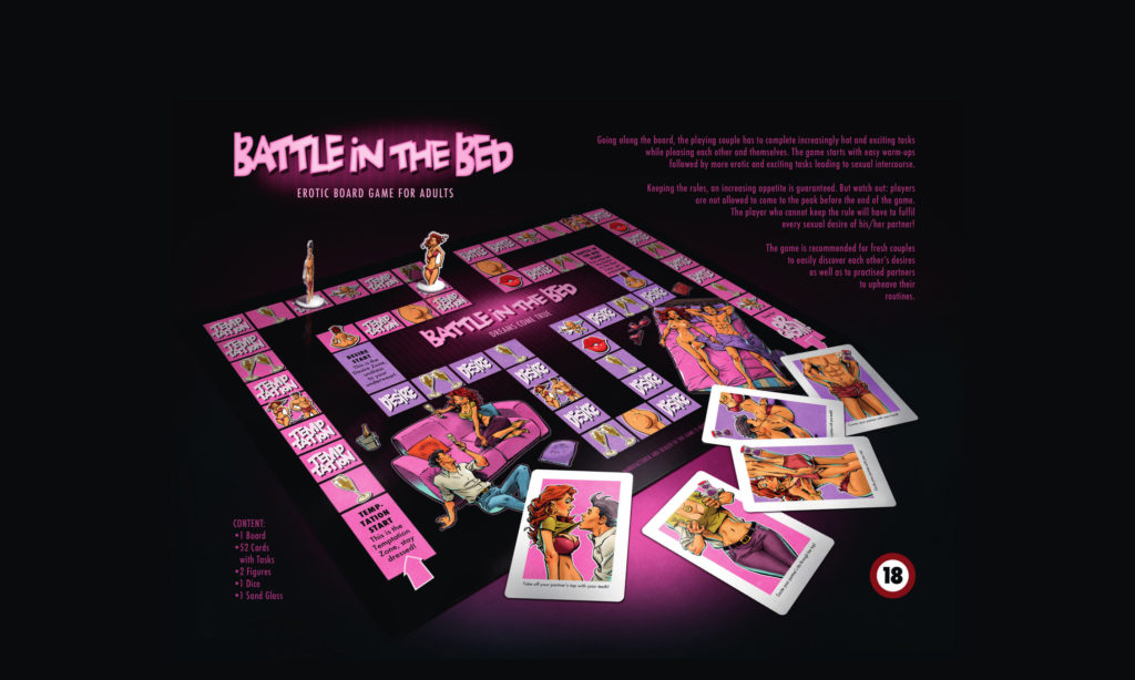 Battle In The Bed Dreams come true For 2 players Playing time: 45-60 minutes Adult board game for a couple The aim of the game is to reach joyful, mutual satisfaction. Perfect for new couples to get to know each other and great for bringing new excitement into longer relationships. Carrying out ever steamier tasks … Continue reading Board game summary
